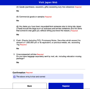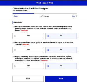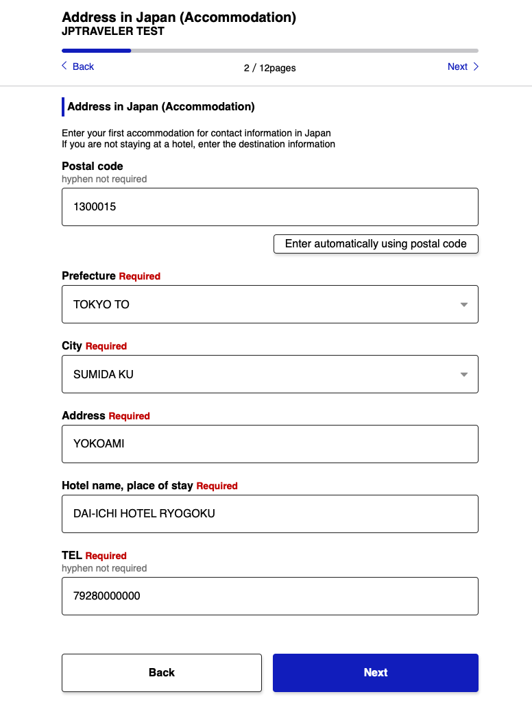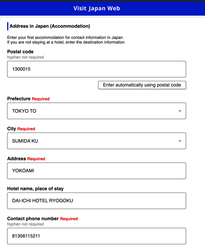“Point of embarkation” - можно выбрать из выпадающего списка, откуда ваш рейс прилетает в Японию.Заполнить данные о проживании в первой гостинице. Удобно в первом поле указать индекс и нажать заполнить автоматически. Дальше останется только указать название отеля и свой телефон.На последнем этапе подтвердить итоговые данные поездки.
