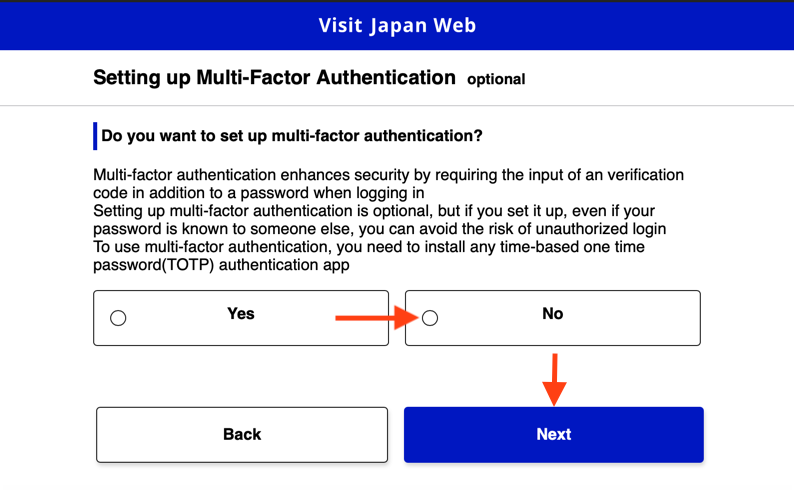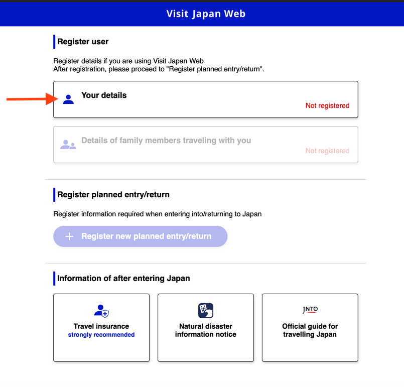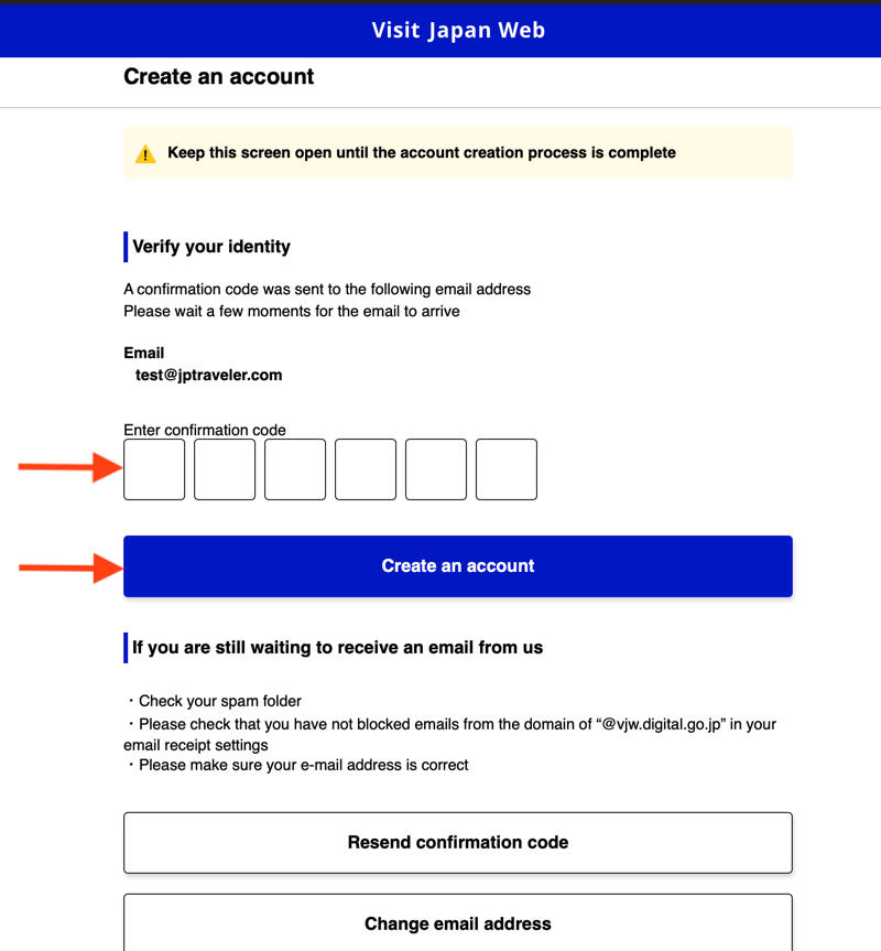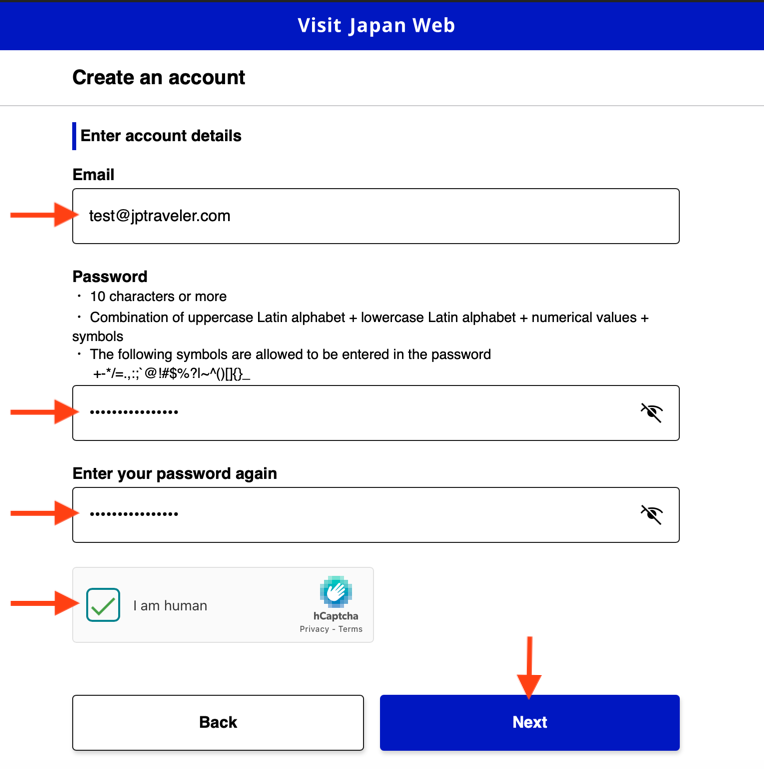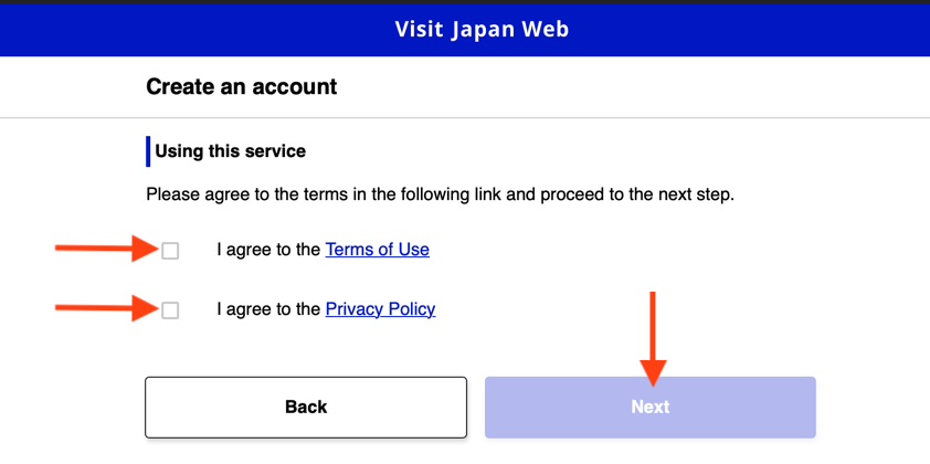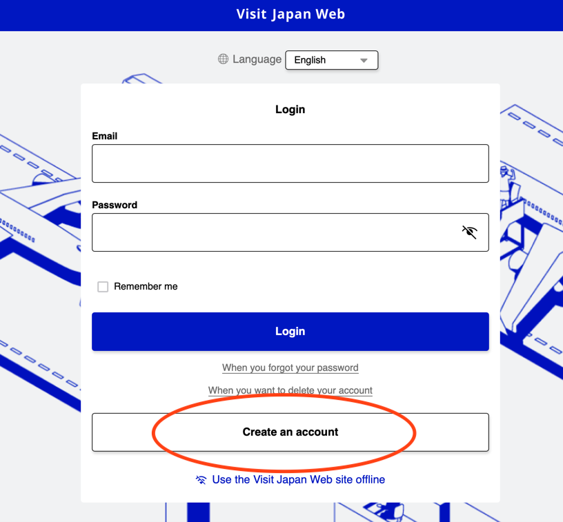 Если сайт открылся на японском, то справа наверху переключитесь на английский(English).Для начала необходимо создать новый аккаунт, который можно будет переиспользовать при повторных поездках. Нажмите “Create an account”.Необходимо отметить согласие с условиями и политикой сервиса.Укажите ваш email и создайте пароль от 10 символов, с большими и маленькими латинскими буквами и спецсимволами и нажать Create an account.На указанную почту придёт код подтверждения, который нужно будет указать в полях и закончить “Create an account”.