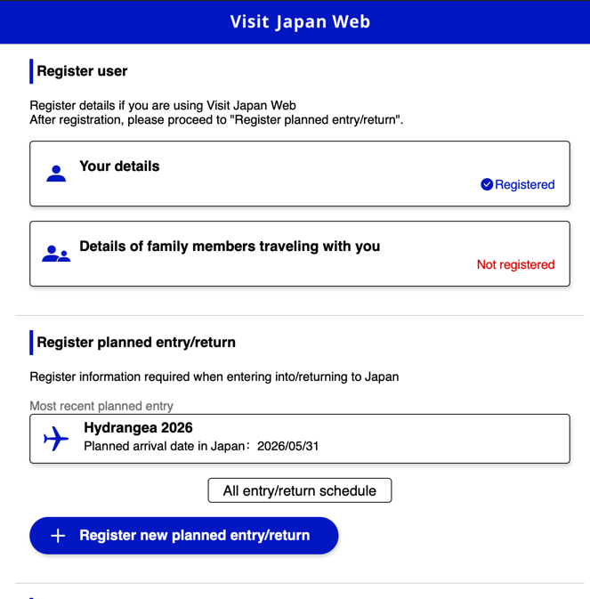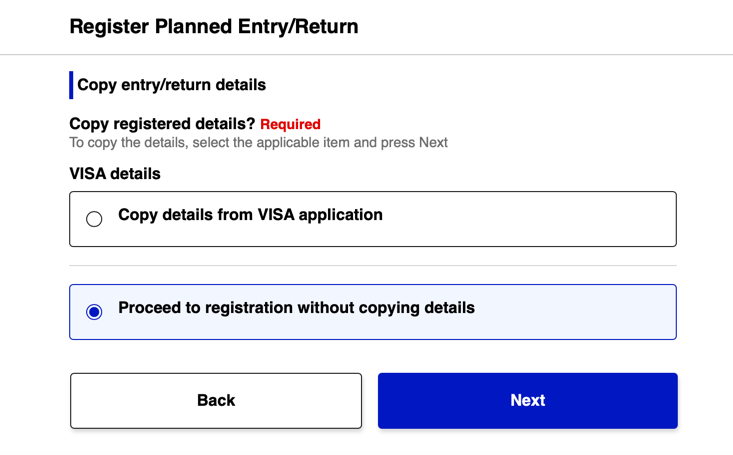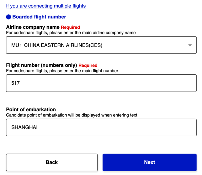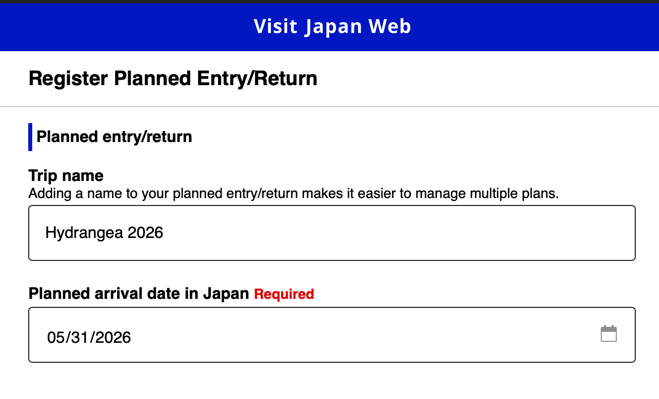 Нажимаем на “Register new planned entry/return” для создания новой поездки.При следующих поездках мы сможем переиспользовать данные о визу из прошлых, но для первой пока выбираем продолжить без копирования.Указываем название поездки для себя и дату прилёта в Японию.Указываем какой авиакомпанией прилетаем и рейс. Лучше искать по полному имени рейса - например MU 517, MU в первое поле для выбора, 517 во второе.
